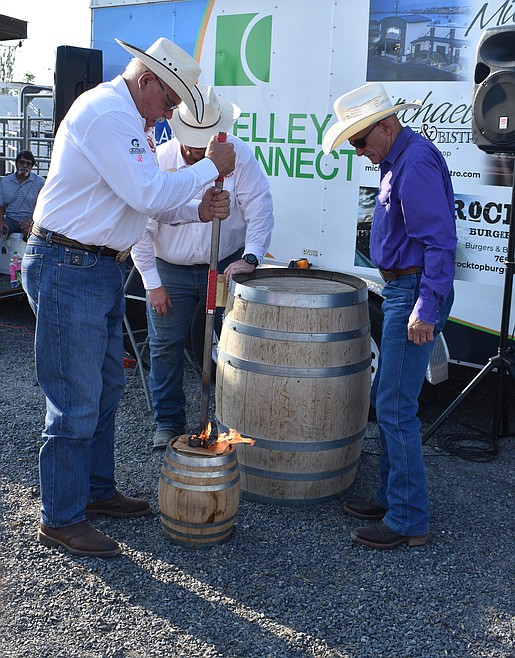 MOSES LAKE — Moses Lake Roundup Committee Member Buck Naff, left, burns a brand into a barrel of the rodeo’s new signature whiskey, Spurstride Wheated Bourbon, at the Loading Chute at the rodeo grounds Tuesday, accompanied by fellow Committee member Joe Ketterer and state Rep. Tom Dent, R-Moses Lake. Spurstride, distilled especially for the Moses Lake Roundup by Moses Lake Distillery, was served to the public for the first time at the Moses Lake Chamber of Commerce’s Business After Hours following the branding.