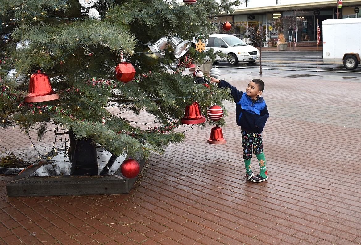 MOSES LAKE — Six-year-old Ellyas DeLaRosa introduces his Elf on the Shelf to the Christmas tree at Sinkiuse Square on Tuesday. Because it was Christmas Eve, his mom Velma DeLaRosa explained, Ellyas was finally allowed to touch the elf, and so he was taking the elf on a tour of places he likes around Moses Lake.