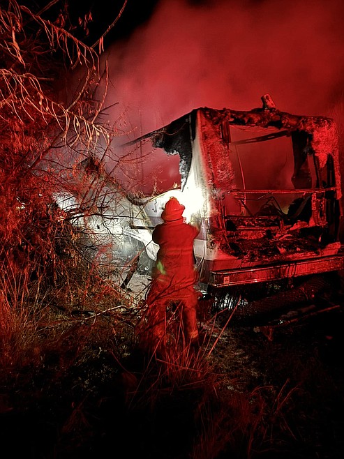 ELECTRIC CITY — An RV camper was destroyed in a fire Friday alongside Osborne Bay south of Electric City, according to a statement from the Grand Coulee Volunteer Fire Department.