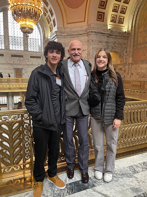 OLYMPIA – Ephrata School Board Student Representative Charles Flynn, left, State Representative Tom Dent, R-Moses Lake, and Ephrata School Board Student Representative Kadie McMullen stop for a photo at the capitol in Olympia in late January. The two student board members joined various officials from the Ephrata School District in visiting the state capitol to discuss education priorities with Dent, Rep. Alex Ybarra, R-Quincy, and Sen. Judy Warnick, R-Moses Lake.