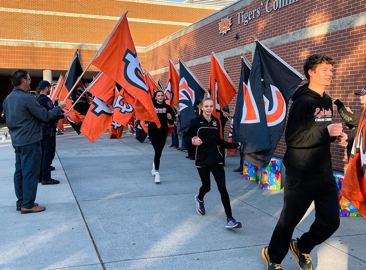 EPHRATA – The Ephrata School District had a flag day Friday. Residents gathered around Ephrata High School to make a tunnel for the Ephrata Cross Country athletes to celebrate their qualification into state competition. The athletes going to state are Abigail Chamberlain, Hannah Malone, Savannah Harper, Maddax Iverson and their coach Cale Fronsman.