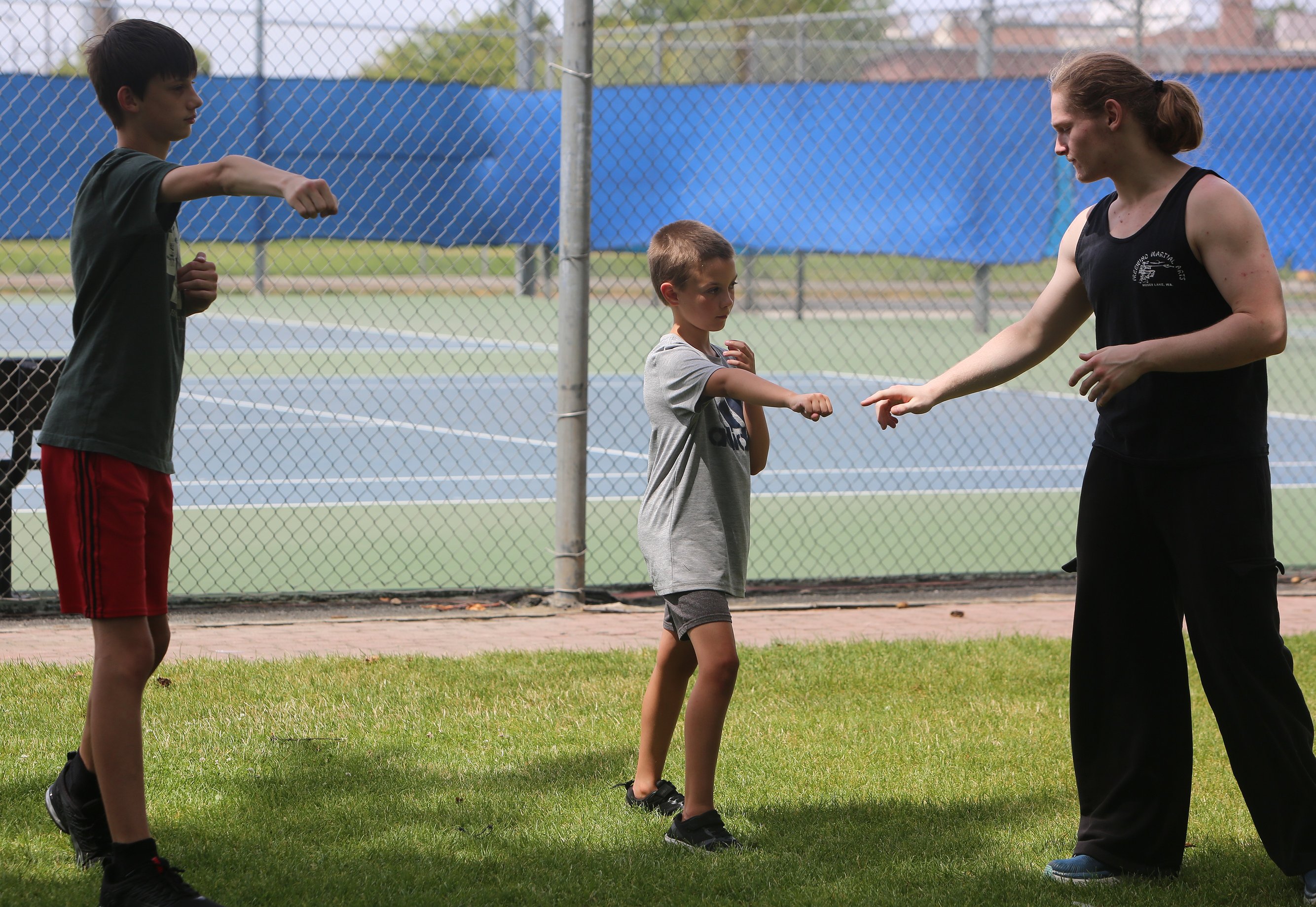 Two students practice striking techniques with the help of Jacob Guertin, an instructor with Freewind Martial Arts, at a seminar in McCosh Park July 18.