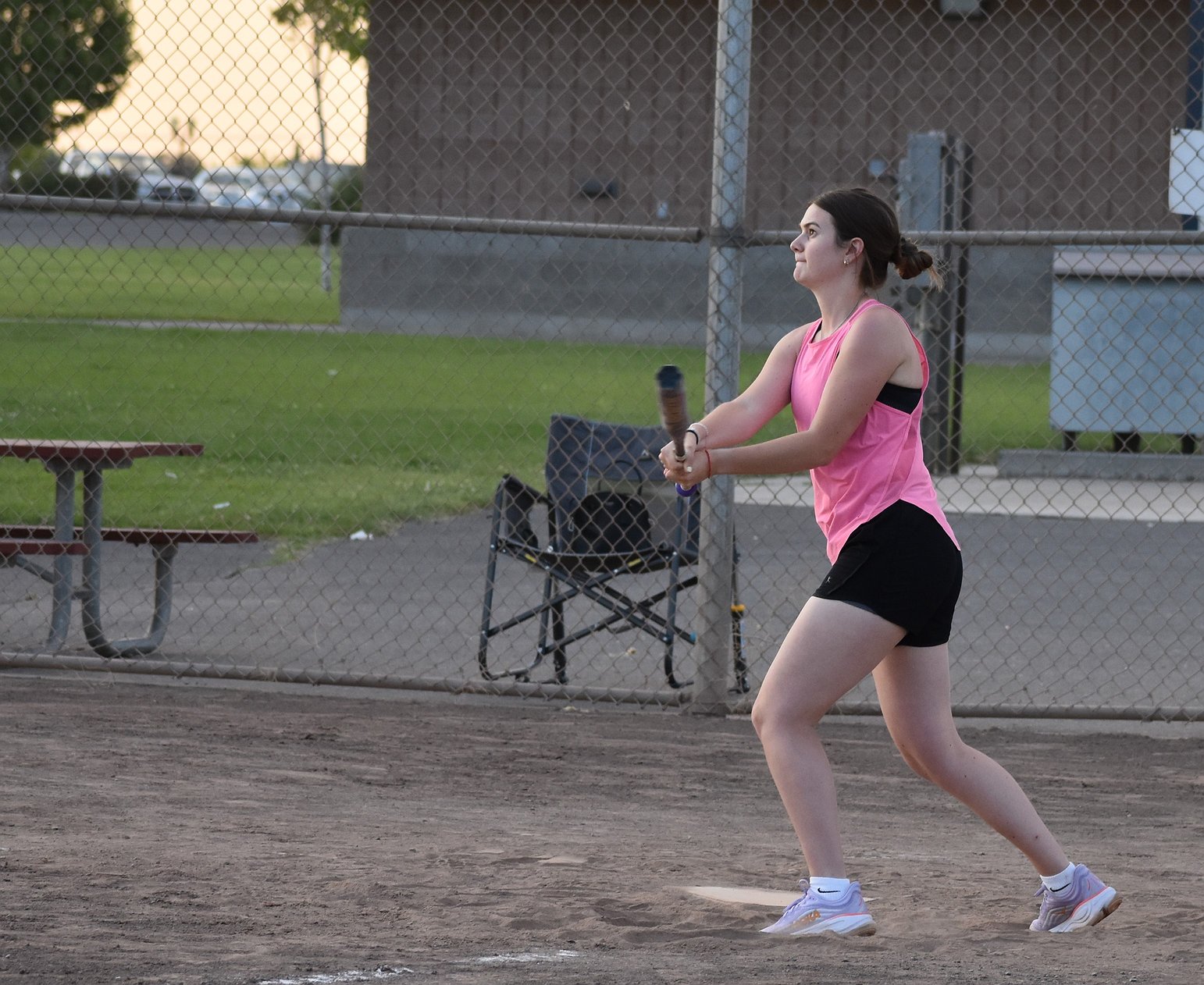 A player from Pitch Please runs toward first base during the team’s game against the Sunsplash Sluggers in Moses Lake’s coed softball league.