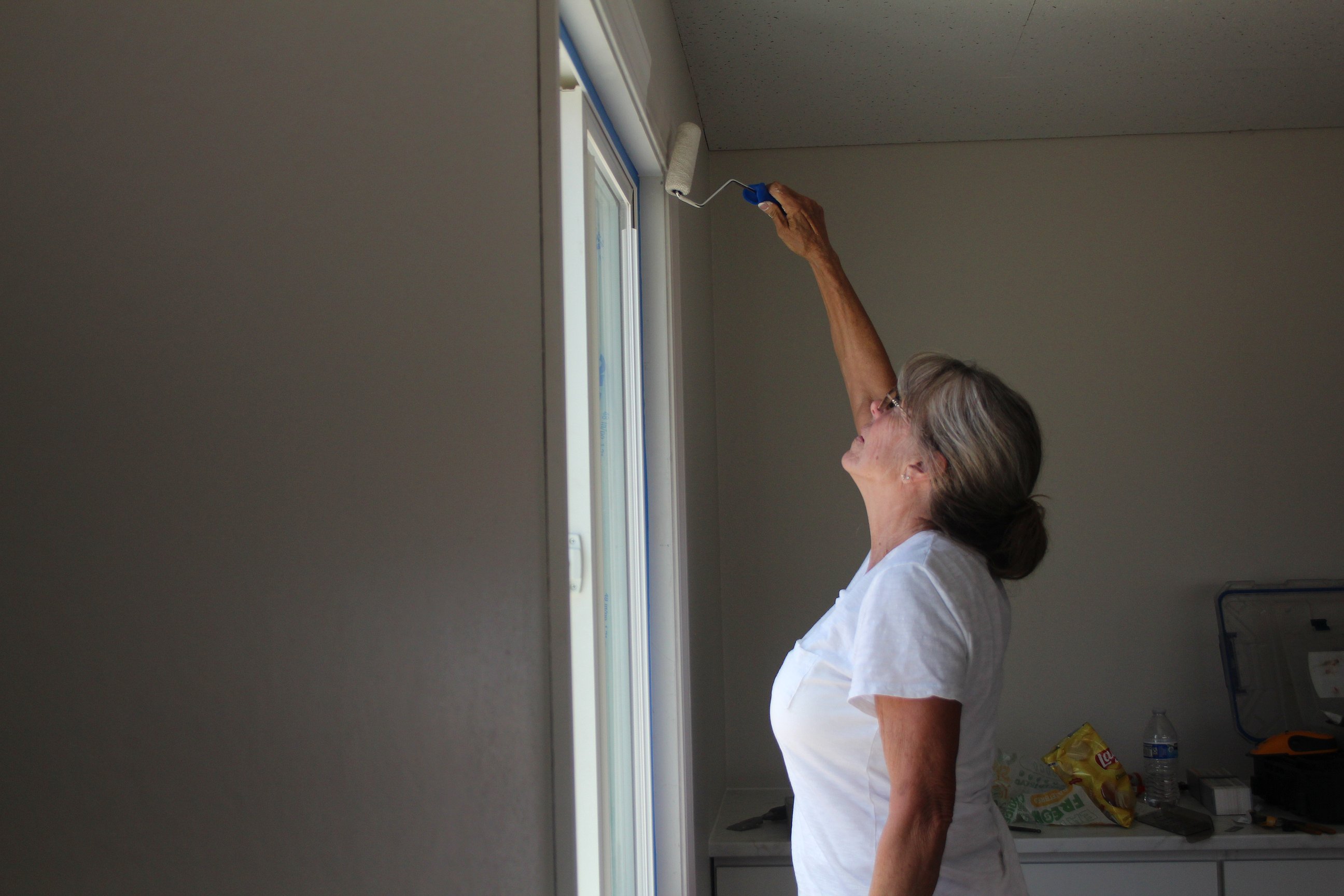 Vickey Melcher puts the finishing touches on freshly painted windowsills around a new window in the Republican booth at the Grant County Fairgrounds July 25.
