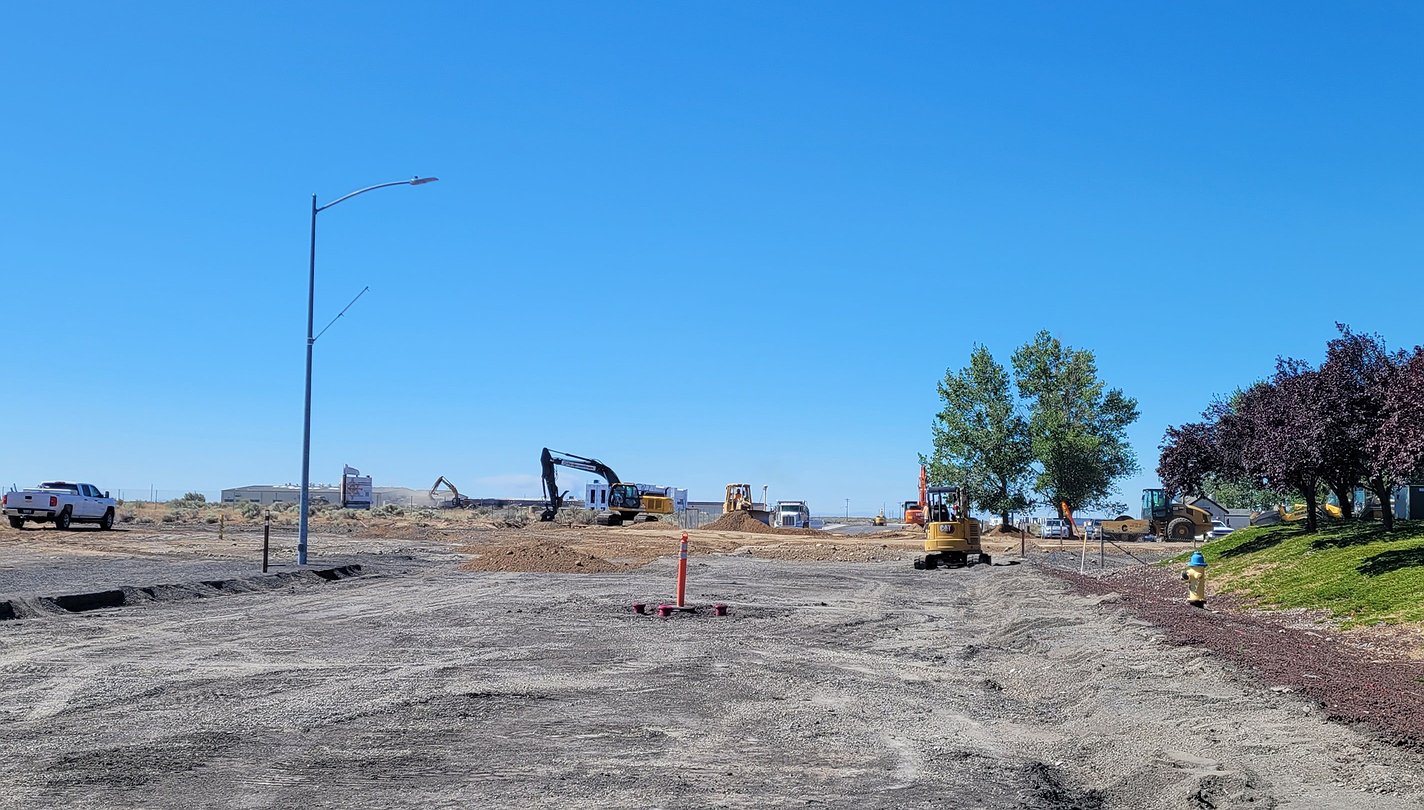 Crews work on the new roundabout at the intersection of state Route 282 and Nat Washington Way in Ephrata July 26.