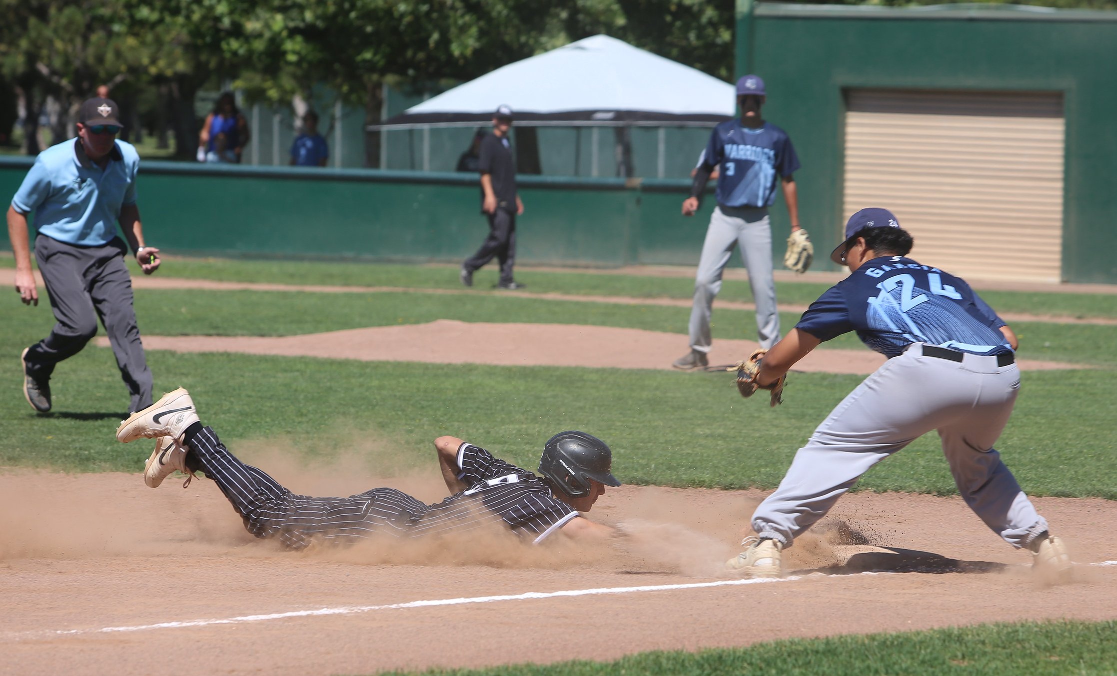 Drake Hansen of the Sixers 14U baseball team dives into third base to complete a triple play July 26.