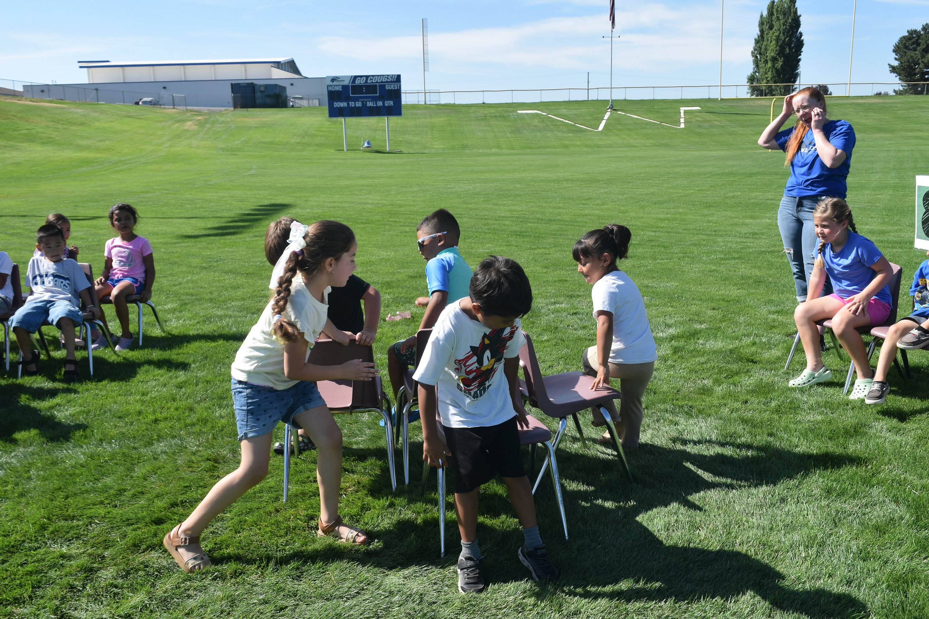 A group of Warden summer school students plays a competitive game of musical chairs at Summer School Field Day July 29.