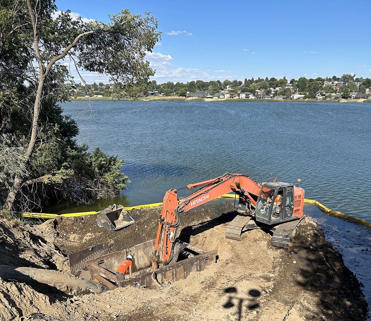 Repair crews work on a damaged wastewater line on the shore of Moses Lake in mid-July. The first phase of repairs has been completed.