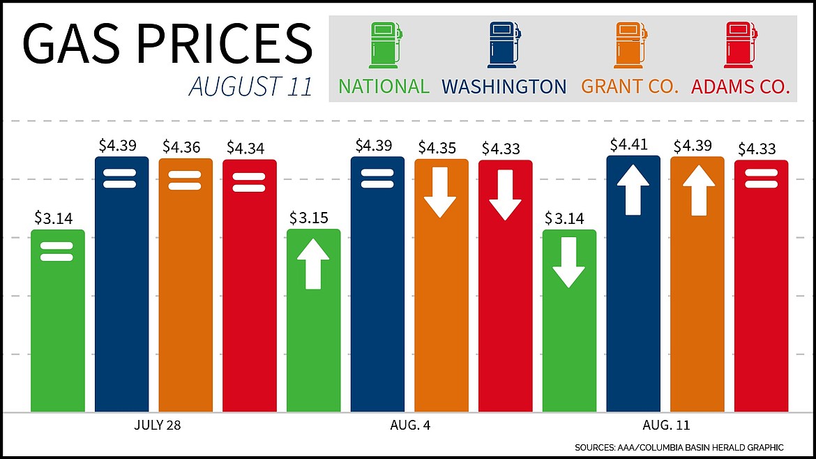 MOSES LAKE – Washington and Grant County both saw slight increases in fuel prices this week. Adams County remained steady and national prices saw slight decreases.
