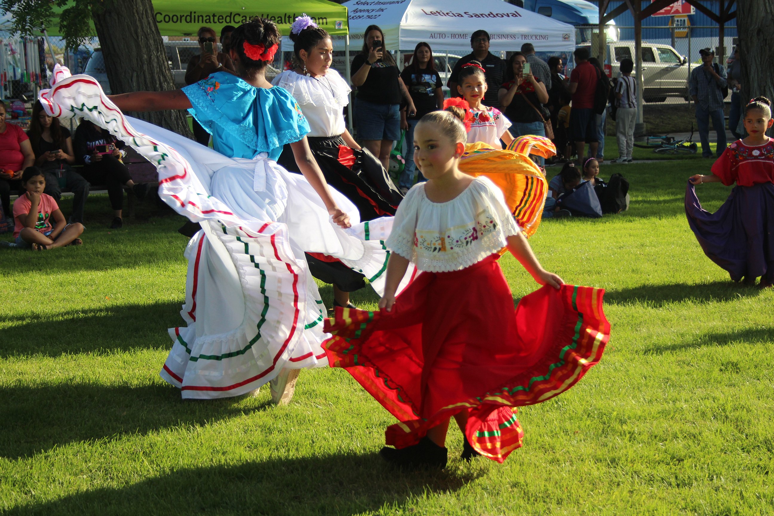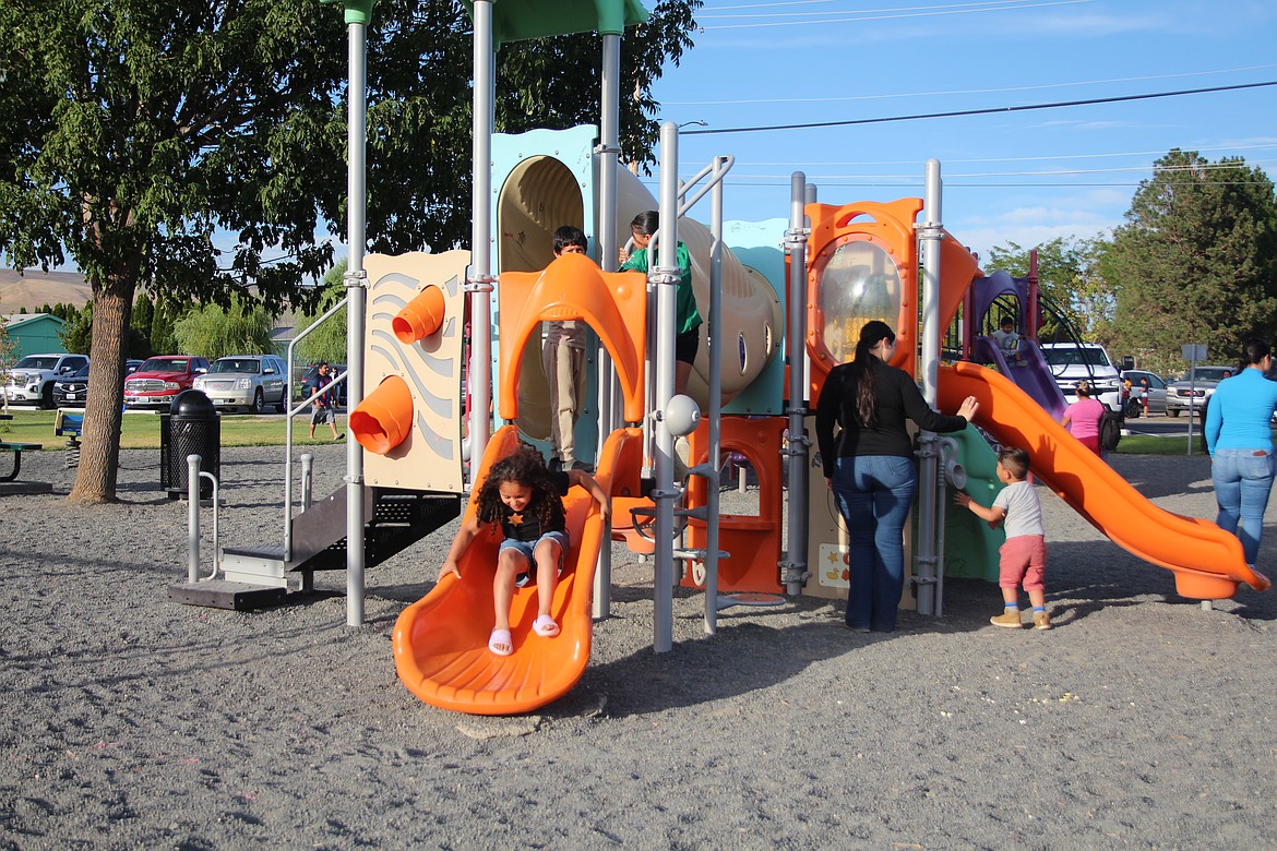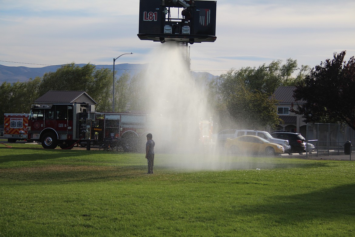 Grant County Fire District 8 brought out the ladder truck and set it up to spray water at one end of the park, while local organizations set up information booths. The Pequenos Guerreros dance troupe from the Wahluke School District was invited to perform at a state educational conference this week, and showed off what they could do at National Night Out.