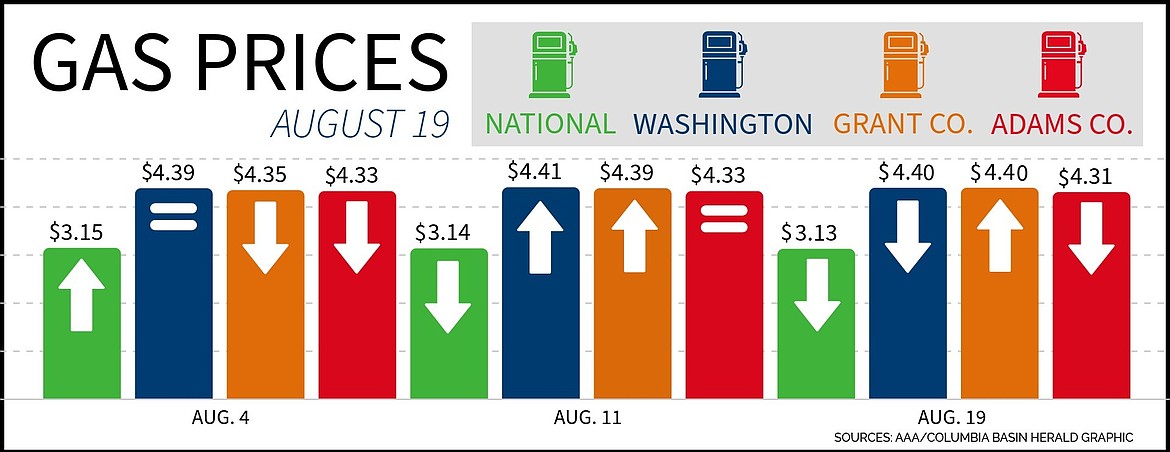 MOSES LAKE – Washington, Adams County and nationally all saw slight decreases in gas prices this week. Grant County saw slight increases in average fuel prices this week, according to AAA.
