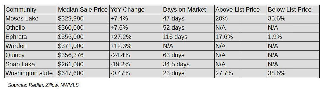 MOSES LAKE — Median home sale prices changed from community to community around the Columbia Basin over the last year, according to the real estate website Redfin.