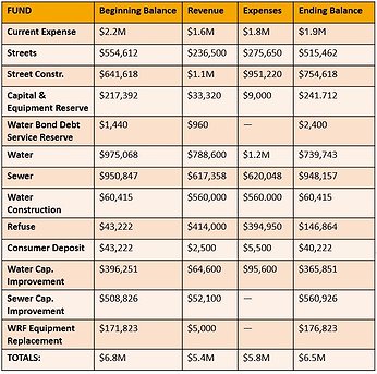 The current expense fund is projected to generate about $20,000 less in revenue than budgeted expenses. The current expense fund balance is projected to drop about $200,000 The budget also includes money for street construction, a new well, and planning for a new wastewater treatment facility.