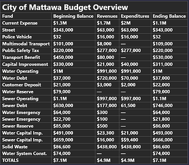 The general fund pays for most city operations, including the Mattawa Police Department, and at least part of the wages and benefits for most city workers. Other city services, such as water and sewer, have designated funds and their own revenues.