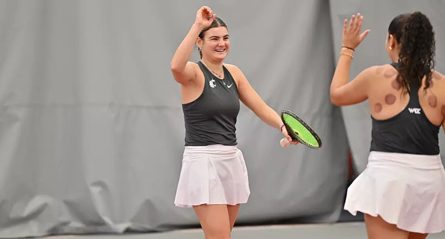 The day began with doubles where WSU's No. 1 duo of Eva Alvarez Sande and Maxine Murphy went back and forth early on with Mika Ikemori and Isabella Bringas but found their groove late as they won the final three games to close out a 6-3 victory. WSU clinched the opening point on Court 2, where Hania Abouelsaad and Martina Markov never trailed in a 6-4 win over Solia Valentine and Polina Marakhtanova. On Court 3, WSU's freshman duo of Chisato Kanemaki and Martina Puvill were in a close battle throughout the match against Claire Galerkin and Kaia Wolfe before the UC Davis pair held off a few match points en route to a 7-6 (9-7) win.