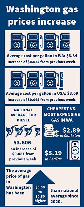 The average price for a gallon of gas in Washington was $3.84, compared to a national average price of $3.09. That was an increase of 3.4 cents per gallon in Washington, the survey said.