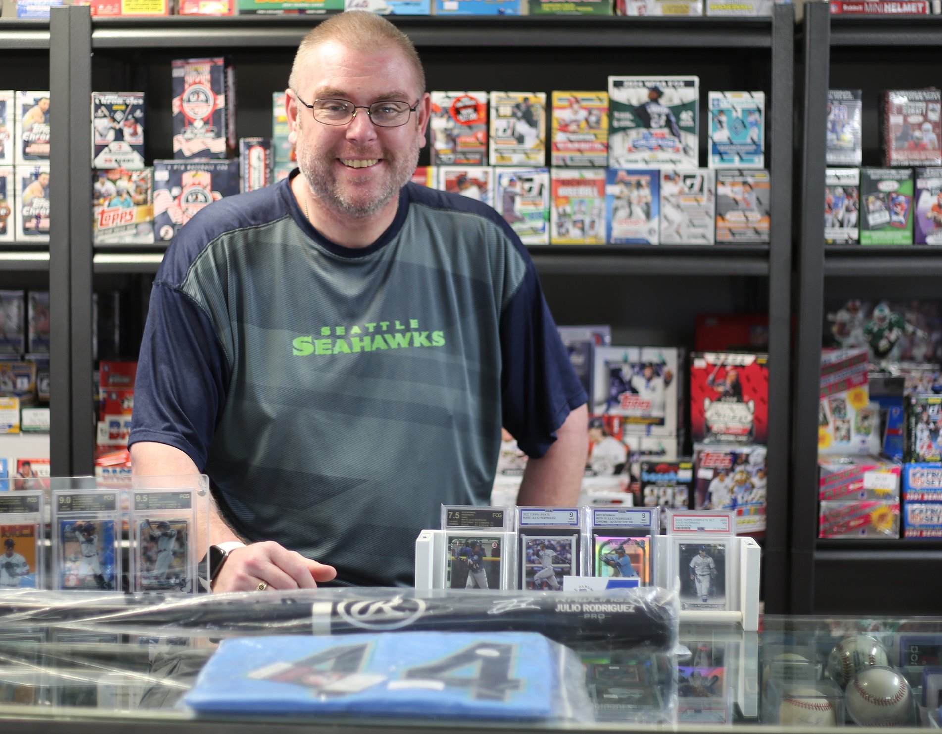 Darren Donoghue, also known as the Cardman, sits among his collection of sports trading cards and memorabilia June 17.