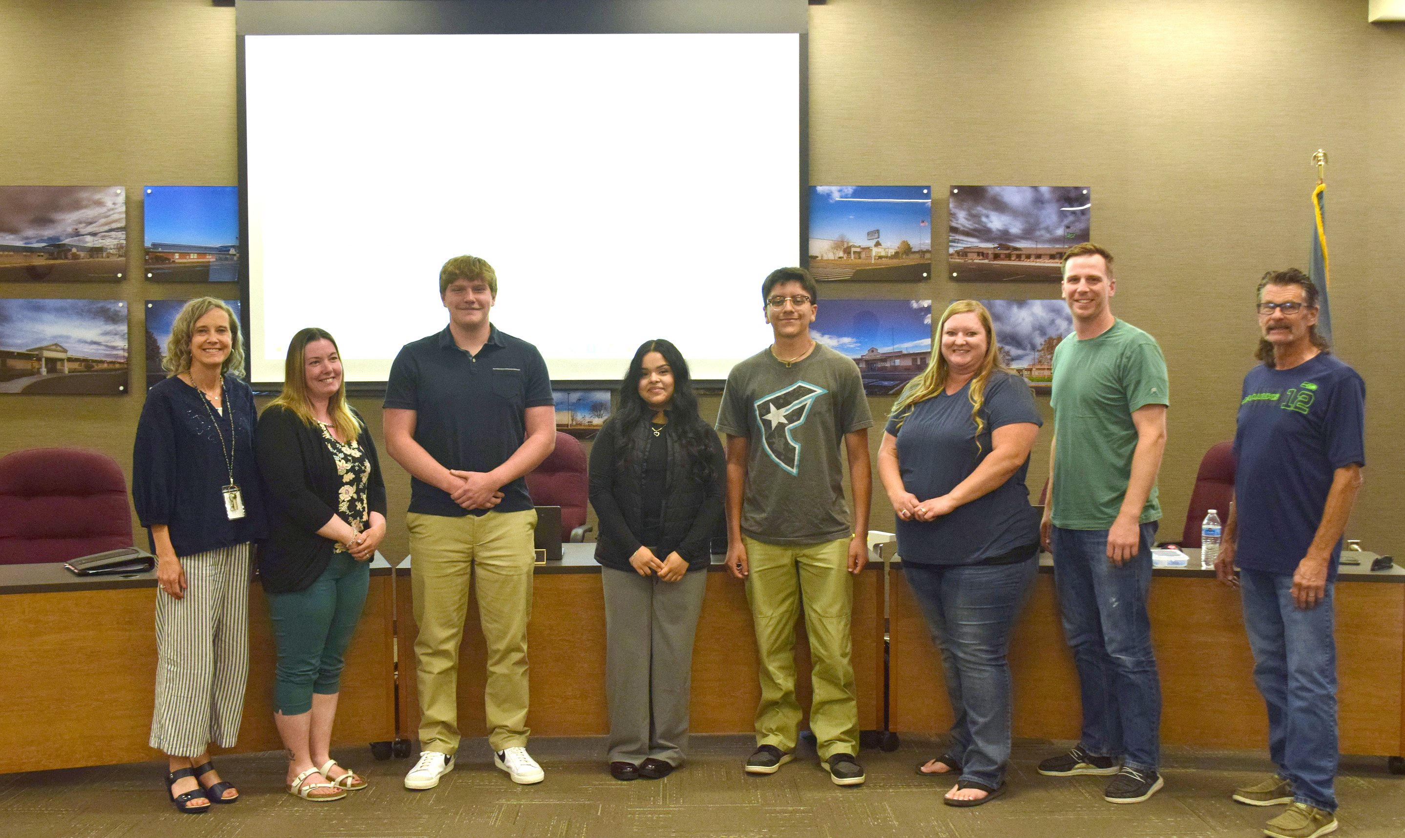 The Moses Lake School Board selected three new student representatives for the 2025-26 school year. From left: Superintendent Carol Lewis, School Board Member Carla Urias, Student Board Representatives Sean King, Emmanuel Zepeda-Lopez and Angie Hernandez, School Board President Kirryn Jensen, School Board Members Ryan Coulston and Paul Hill.