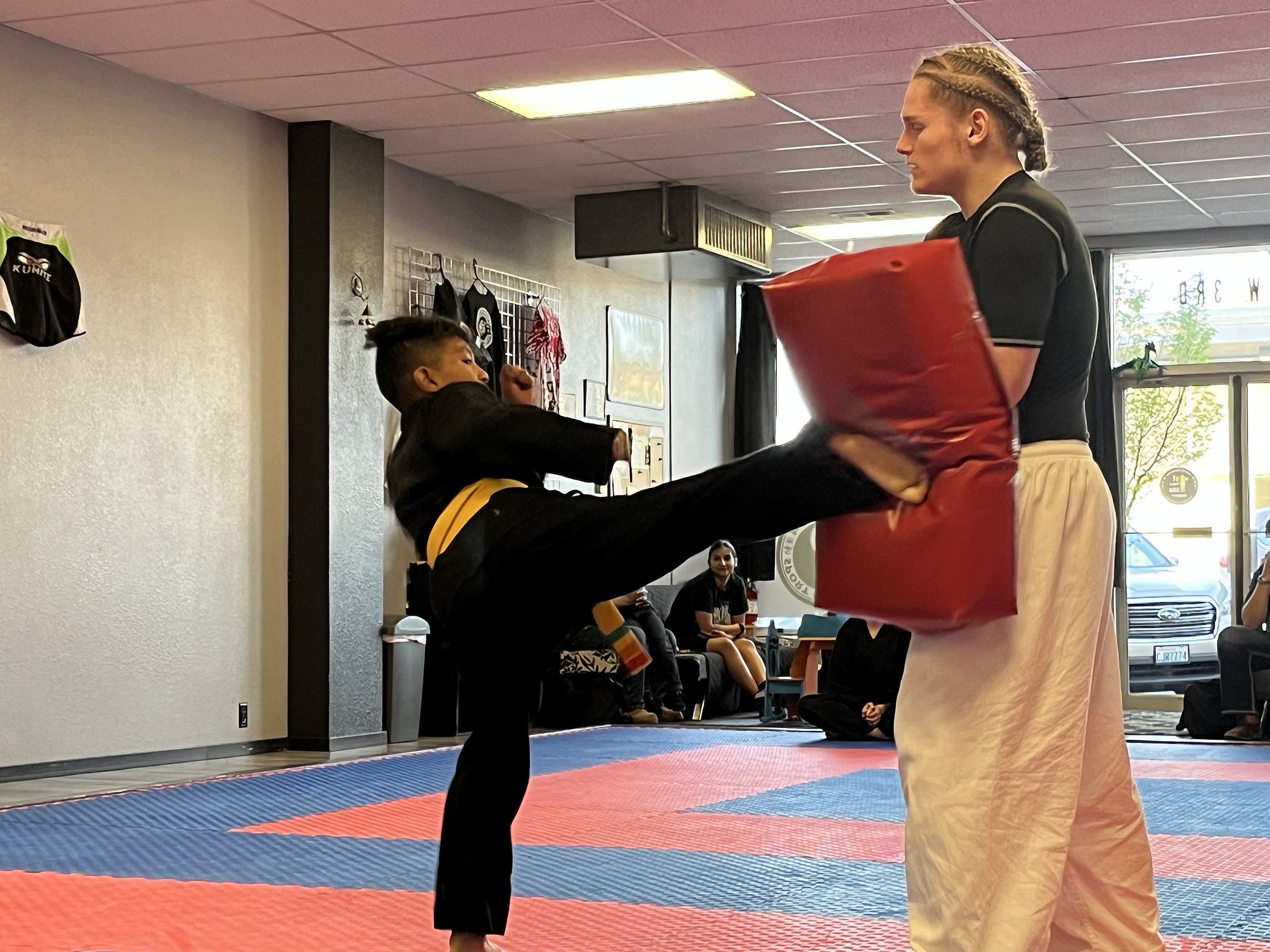 A young student practices his kicks with an instructor at Freewind Martial Arts.