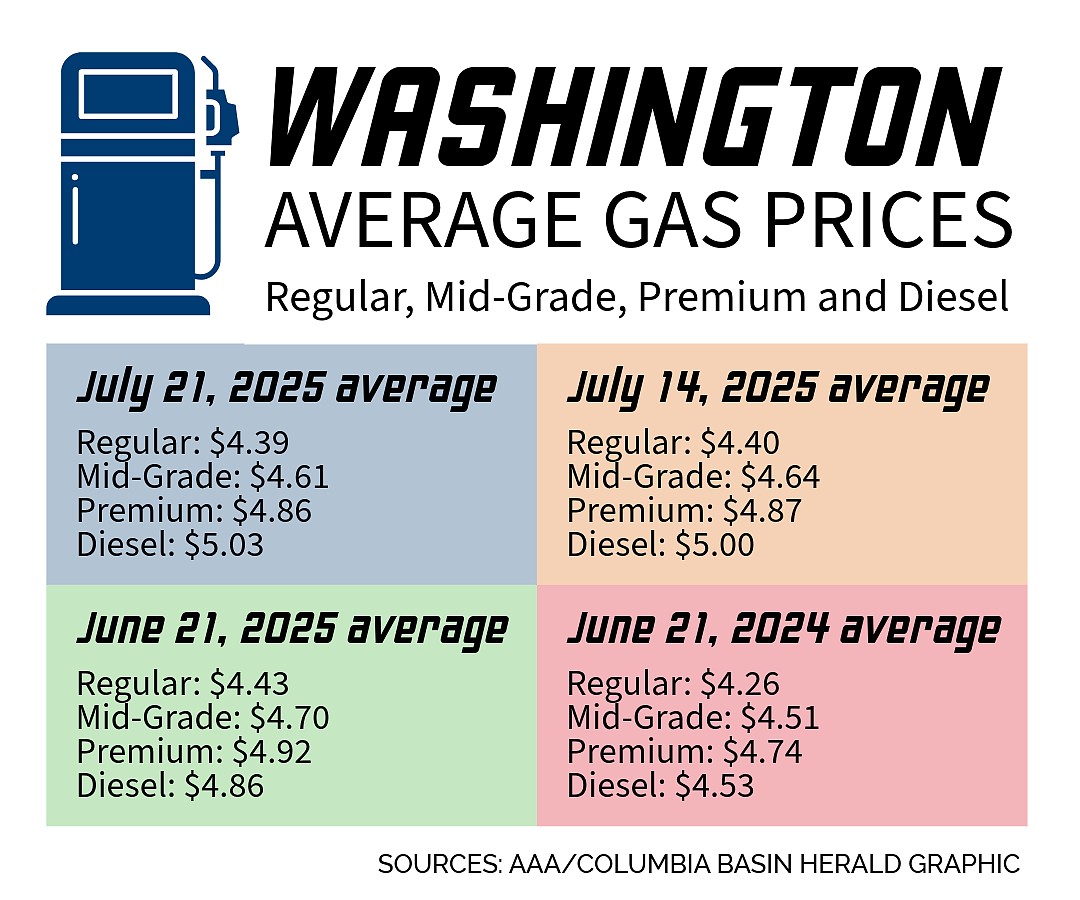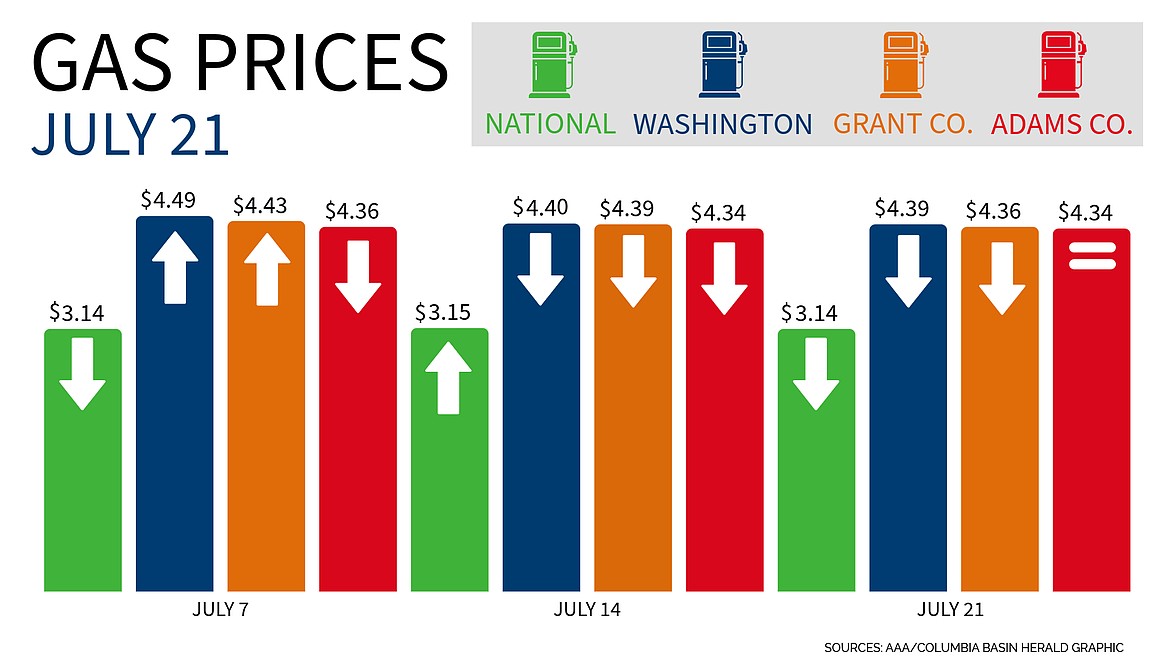 MOSES LAKE — There was a slight decrease in gas prices across the nation, including in Washington and Grant County, according to AAA. The Adams County average remains the same as last week.