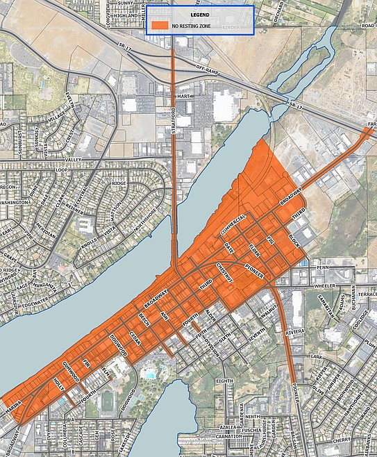The zone also extends along Pioneer Way to East Olive Avenue, and along North Stratford Road to the intersection with SR 17, including the off-ramp and on-ramp. All alleys within the zone are included. So are some adjoining residential neighborhoods, including South Beech, South Ash, South Alder and South Balsam streets, among others.