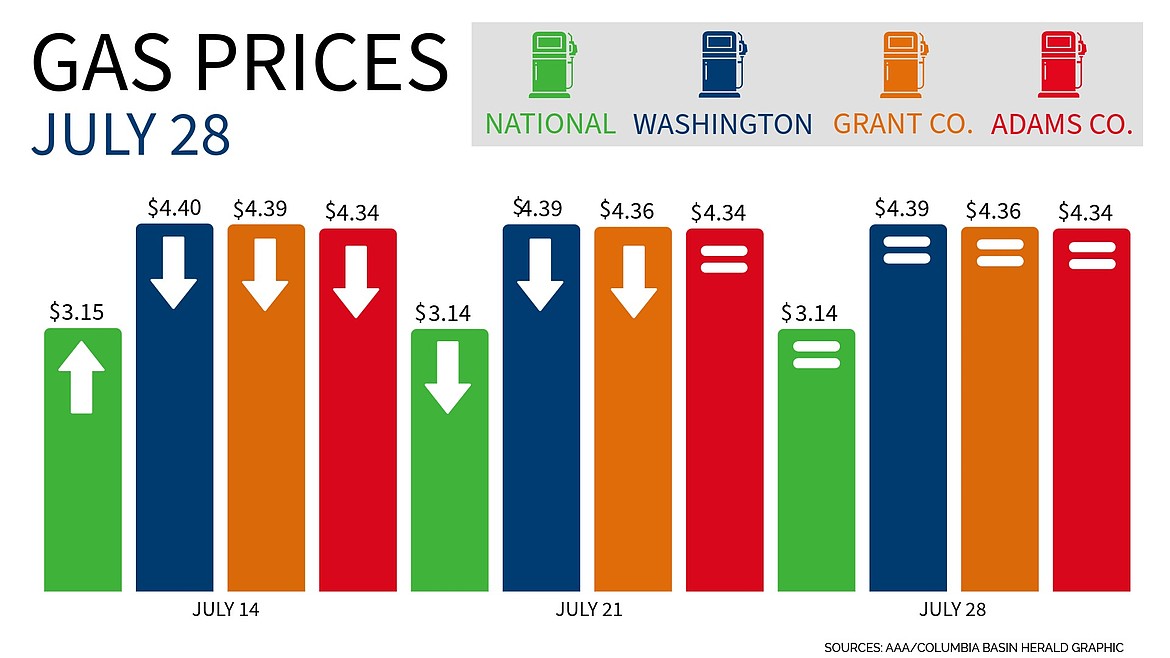 MOSES LAKE — Gas prices in Grant and Adams counties, Washington and nationally are identical to last week.