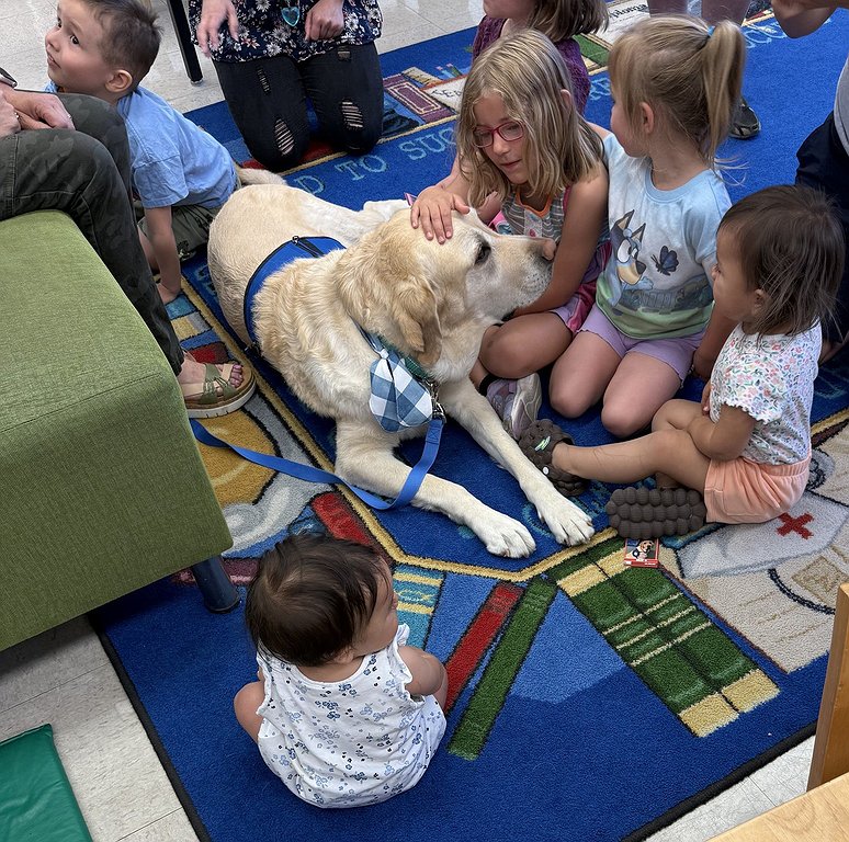 Library staff thoughtfully design each storytime to support early childhood development by fostering a love of books, building early literacy skills, and supporting language development. Through stories, songs, and interactive play, children learn to listen, follow directions, and engage with others – essential skills for kindergarten readiness. Don’t miss an extra special guest on Aug. 12, when we will be joined by Valor, a local facility dog from Kid’s Hope. Kids can snuggle and pet our gentle, furry friend while enjoying stories and songs.