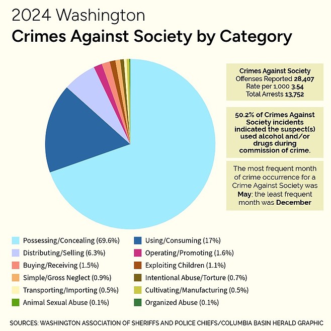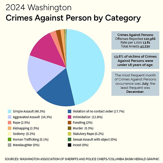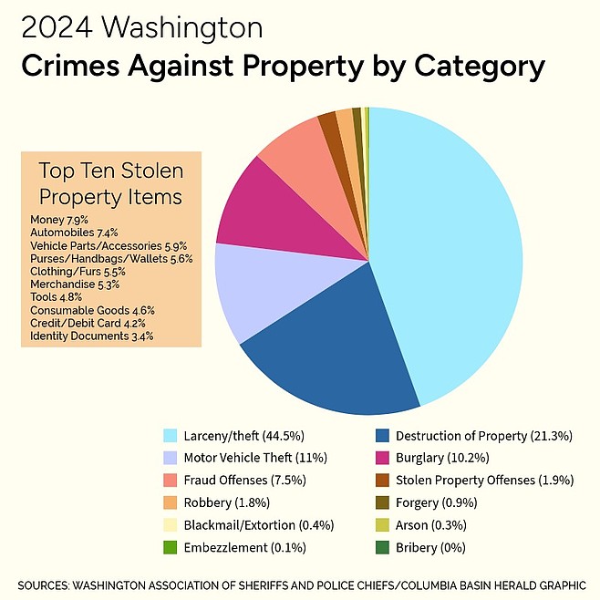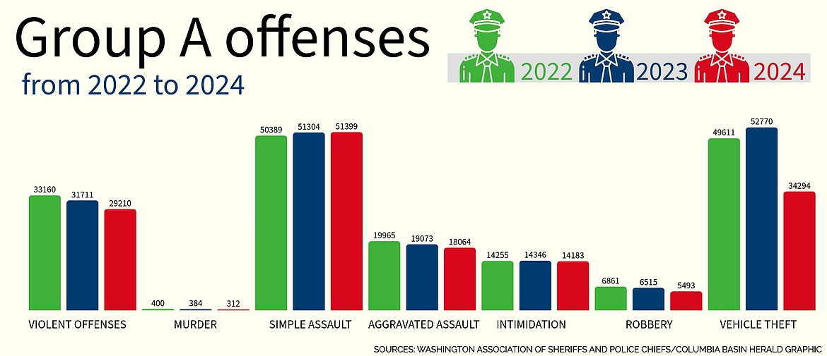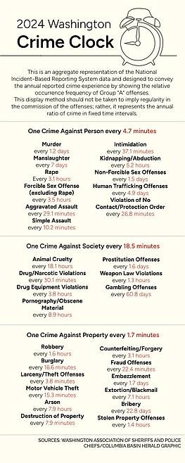 OLYMPIA — In the 2024 Crime in Washington report, published by the Washington Association of Sheriffs and Police Chiefs on Monday, a noticeable decline in crime rates across various categories was reported. Various police chiefs and Grant County Sheriff Joey Kriete said trends found within the report were mostly reflected locally.