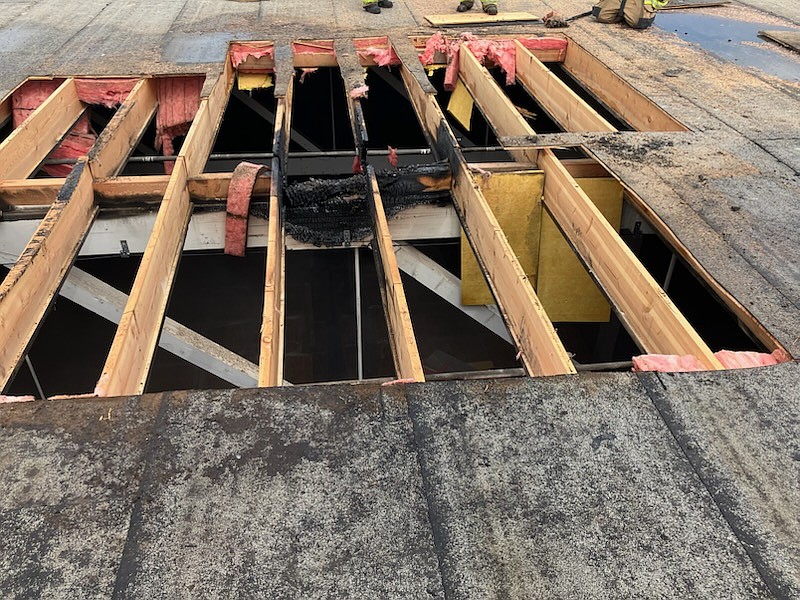 The fire burned a roughly 10-by-10-foot section of the roof of the facility, including into the rafters of the building. The blaze activated the building’s sprinkler system which aided firefighters in their efforts to suppress the fire. Crews cut vent holes in the roof to help isolate the fire and contain its spread.