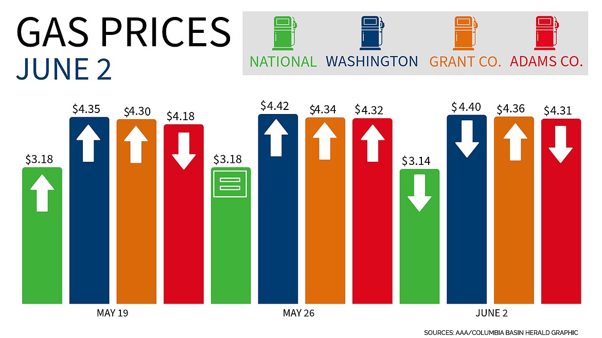 MOSES LAKE – Gas prices this week saw a slight decline in Adams County, Washington and nationally compared to last week, according to AAA. However, in Grant County, there was a two-cent increase on average.