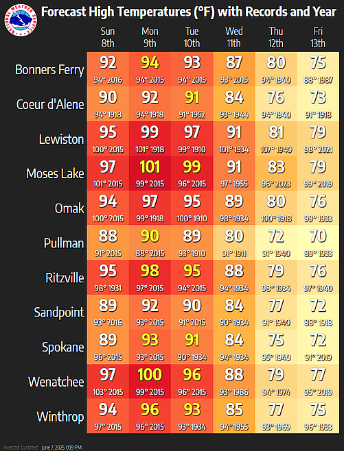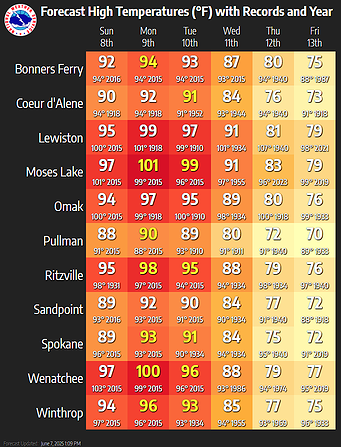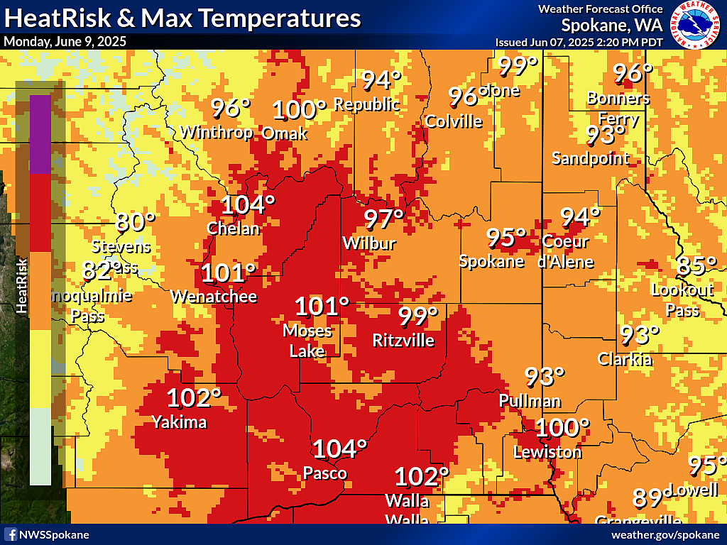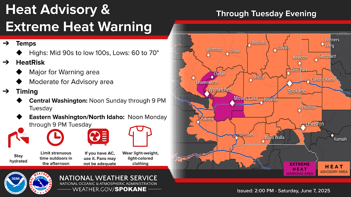 MOSES LAKE – The National Weather Service in Spokane has issued an Extreme Heat Watch for several regions in Central Washington, including the Moses Lake and Wenatchee areas, effective from Sunday afternoon through Tuesday evening.
