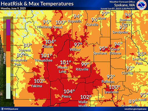 Monday is anticipated to be a moderate to major heat risk, dry and breezy. Tuesday is expected to have a moderate heat risk, dry and breezy. Wednesday is anticipated to be dry and windy with a minor heat risk. Thursday is forecasted to be dry and breezy with isolated thunderstorms in Northeast Washington and a minor heat risk.