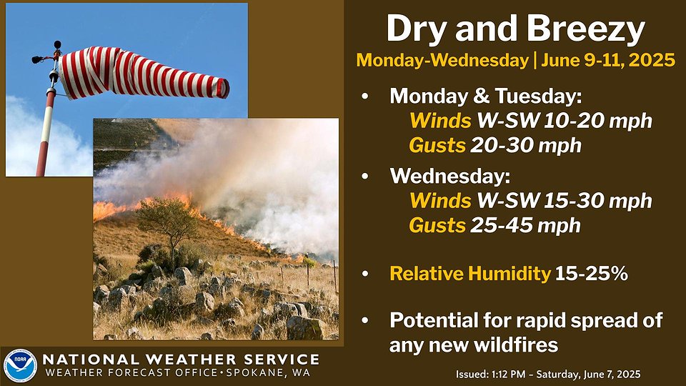 In addition to the heat advisory, the NWS is closely monitoring fire weather conditions. Elevated fire weather risks are anticipated Monday and Tuesday, particularly in Central Washington. Dry and breezy conditions could develop, potentially leading to an increased likelihood of fire spread in dry fuels.
