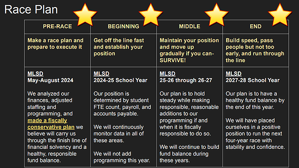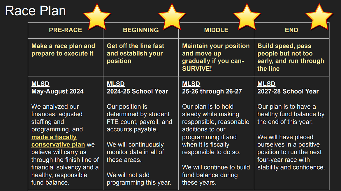 The “pre-race,” which went until August of 2024, included analyzing district finances, adjusting staffing and programming, and making a fiscally conservative plan, which Lewis said she believed will carry them through the finish line. The goal is to ensure financial and educational program stability.