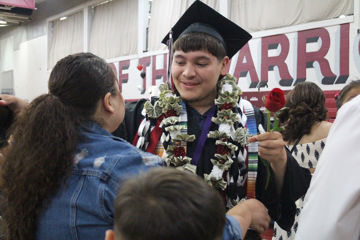 The graduates present roses to some of the people who supported them during their school days, and both recipients and students shed some tears as the seniors fanned out through the crowd.