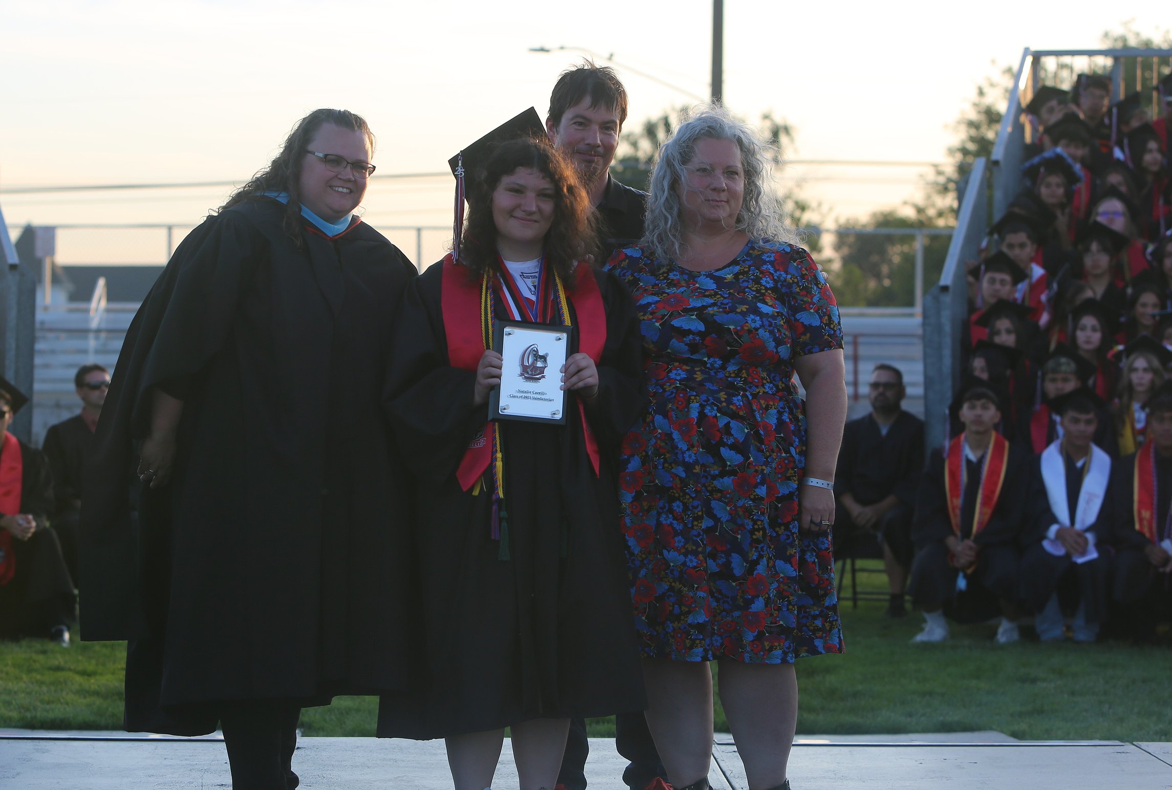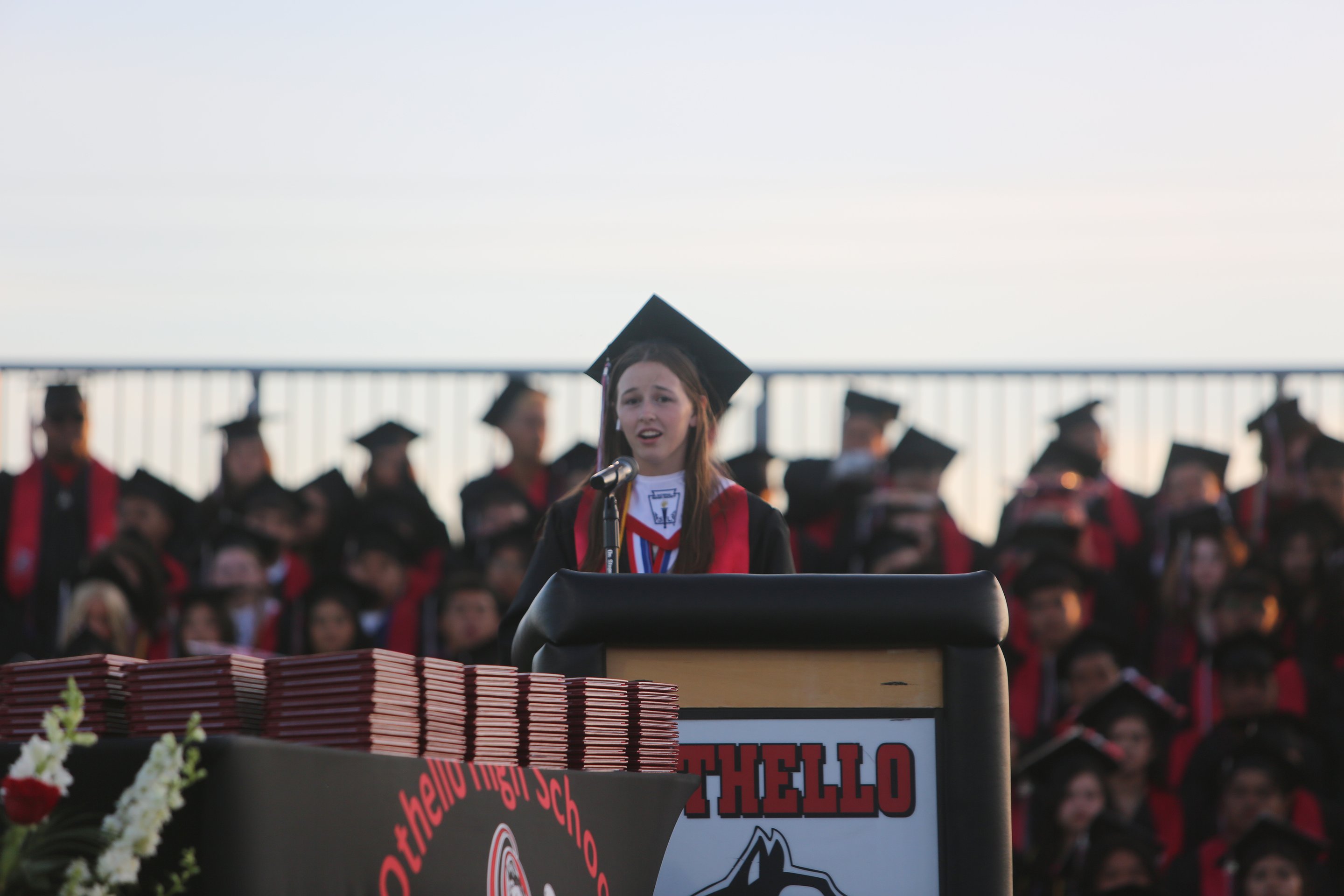 Kathryn Acheson, Othello High School’s principal, opened the ceremony with congratulations to the seniors and parents for reaching this point. She first welcomed Cerrillo for her speech and took a photo with her family. After she spoke, Acheson welcomed co-valedictorian Claire Gilbert for her speech and family photo.