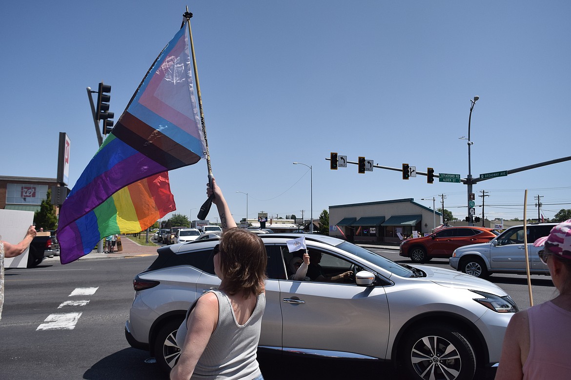 MOSES LAKE – Around 330 people lined East Broadway Avenue and North Stratford Road on Saturday for a “No Kings” protest, according to Grant County Democrat Vice Chair and Protest Co-organizer Jill Springer.