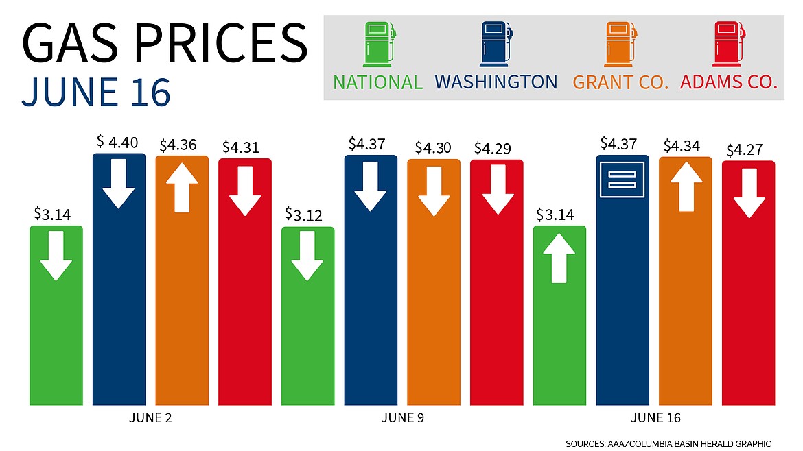 MOSES LAKE — Average gas prices in Grant County and across the nation rose slightly. While in Washington, the average stayed the same for the second week in a row and Adams County saw a slight decrease, according to AAA.