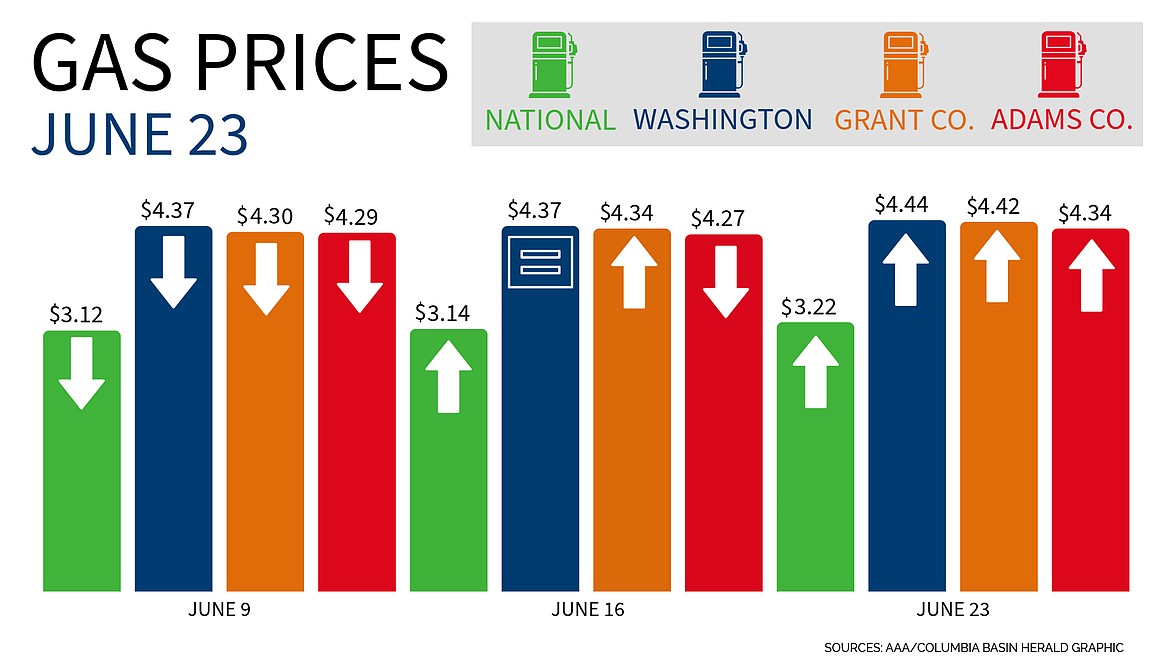 MOSES LAKE – Average gas prices rose across the nation, in Washington and in both Grant and Adams Counties, according to AAA. Washington, an outlier in the nation, is the only state in which prices are higher now than a year ago.