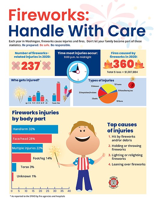 Washington state law allows fireworks sales and use from noon to 11 p.m. June 28 and then from 9 a.m. to midnight June 29-July 3. On the Fourth itself, fireworks can be set off from 9 a.m. to midnight, and then July 5 from 9 a.m. to 9 p.m.