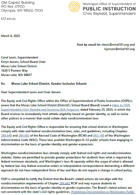 OSPI responded with its own letter dated March 6 from its Equity and Civil Rights Office, addressing concerns about MLSD's new policies. The letter reiterated that the board's intention to limit athletic eligibility based on gender identity contradicted state nondiscrimination laws enshrined in Chapters 28A.640 and 28A.642 of the Revised Code of Washington.
