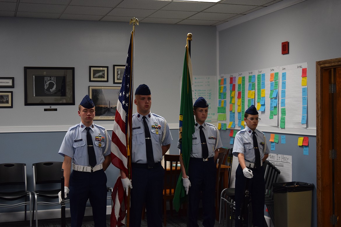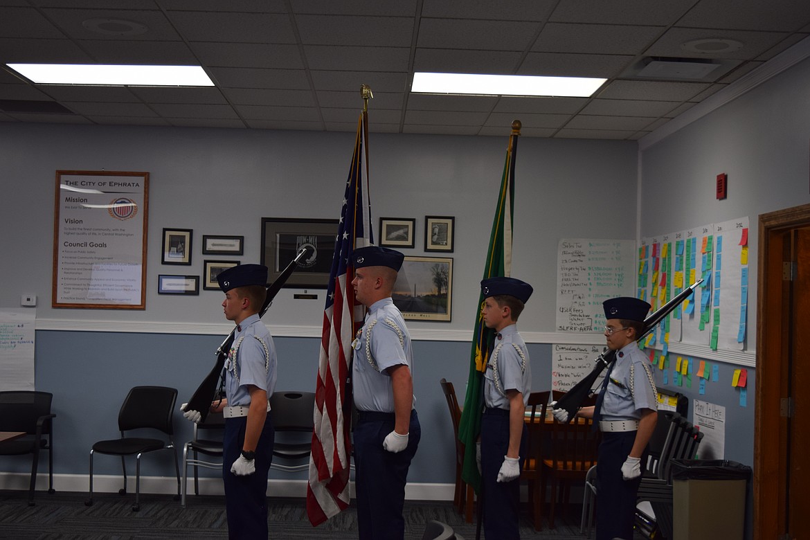 EPHRATA – Civil Air Patrol cadets practiced presenting the colors at an Ephrata City Council workshop Wednesday evening at City Hall. The drill and ceremonies competitors are headed to California for competition soon and wanted to get practice in front of an audience. Kathy Maxwell with the Civil Air Patrol said this is multiple years in a row the Ephrata squadron has qualified for the competition. Members said the competition includes a variety of categories, including physical fitness, knowledge and drill and ceremonies.