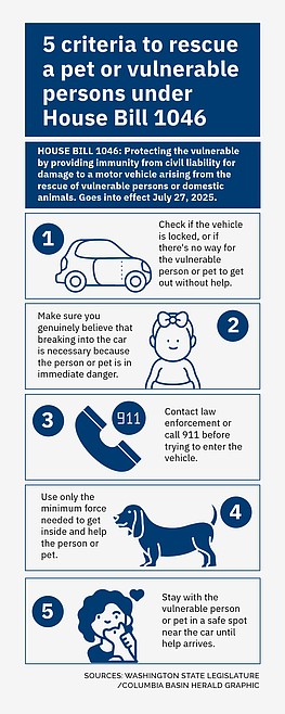 OLYMPIA — The Washington State Legislature has passed House Bill 1046, which grants immunity from civil liability for those who forcibly enter a locked vehicle to rescue a vulnerable person or domestic pet. The bill, passed by both the House and Senate in April and signed into law by Gov. Bob Ferguson, is set to take effect July 27, 2025.