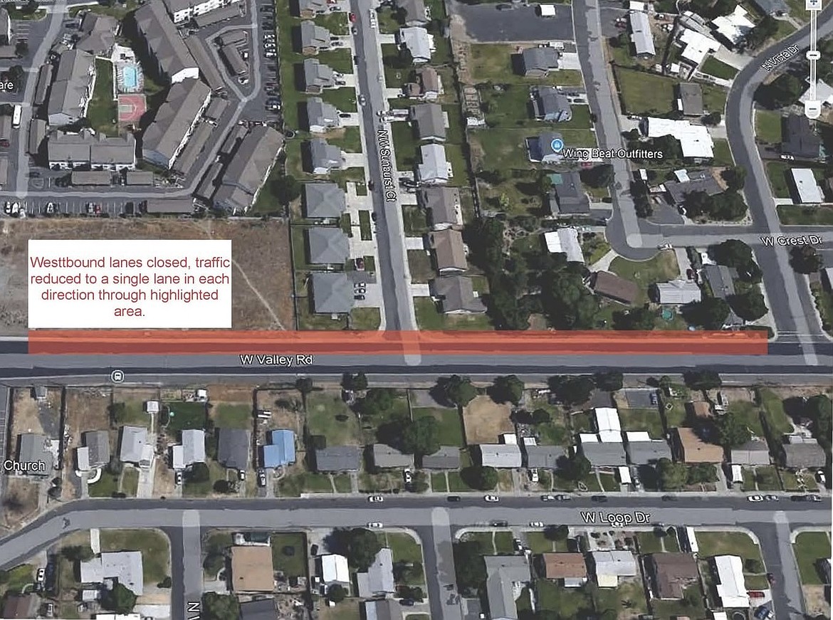 MOSES LAKE – Today from 7 a.m. to 5 p.m. in Moses Lake, Pegram Construction will be closing the two westbound lanes of Valley Road between Sunburst Court Northeast and Grape Drive Northeast to add a new water main connection.