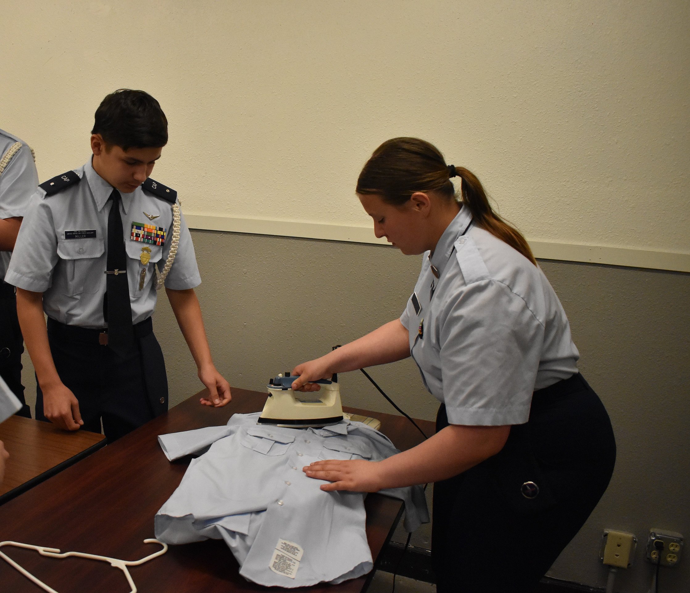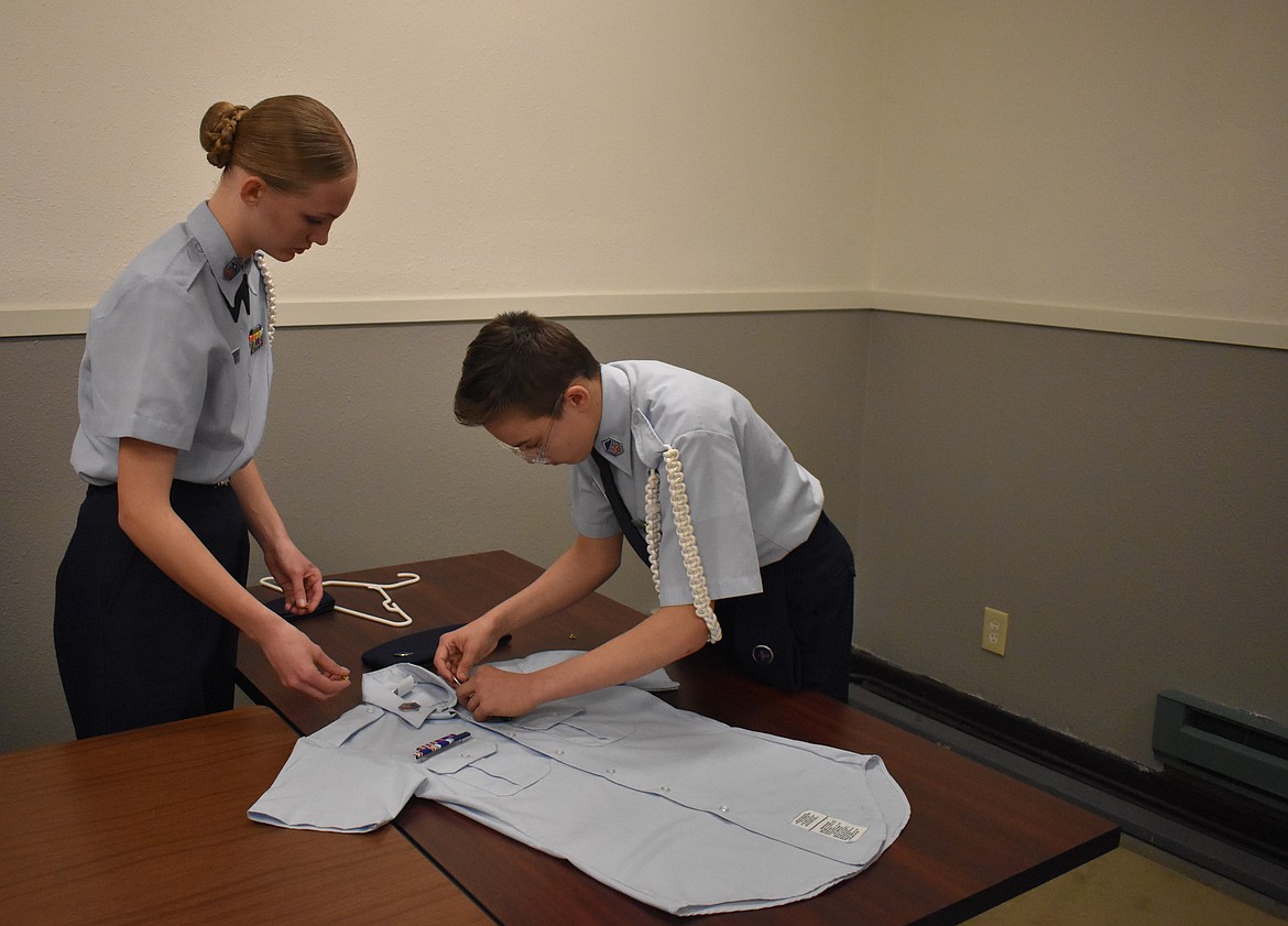 Second Lt. Austyn Miller, left, and Cadet Master Sergeant Maddy Drake iron out a shirt to decorate. The teams will be judged based on both their own uniforms and their ability to create a uniform for a fictional cadet.
