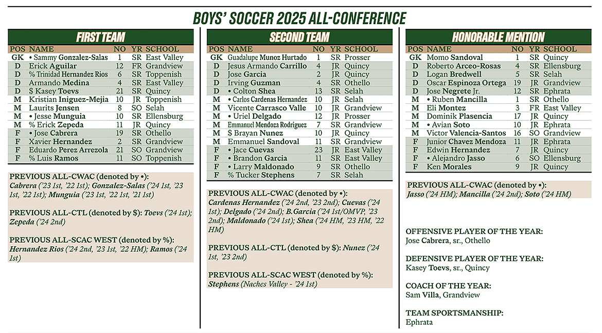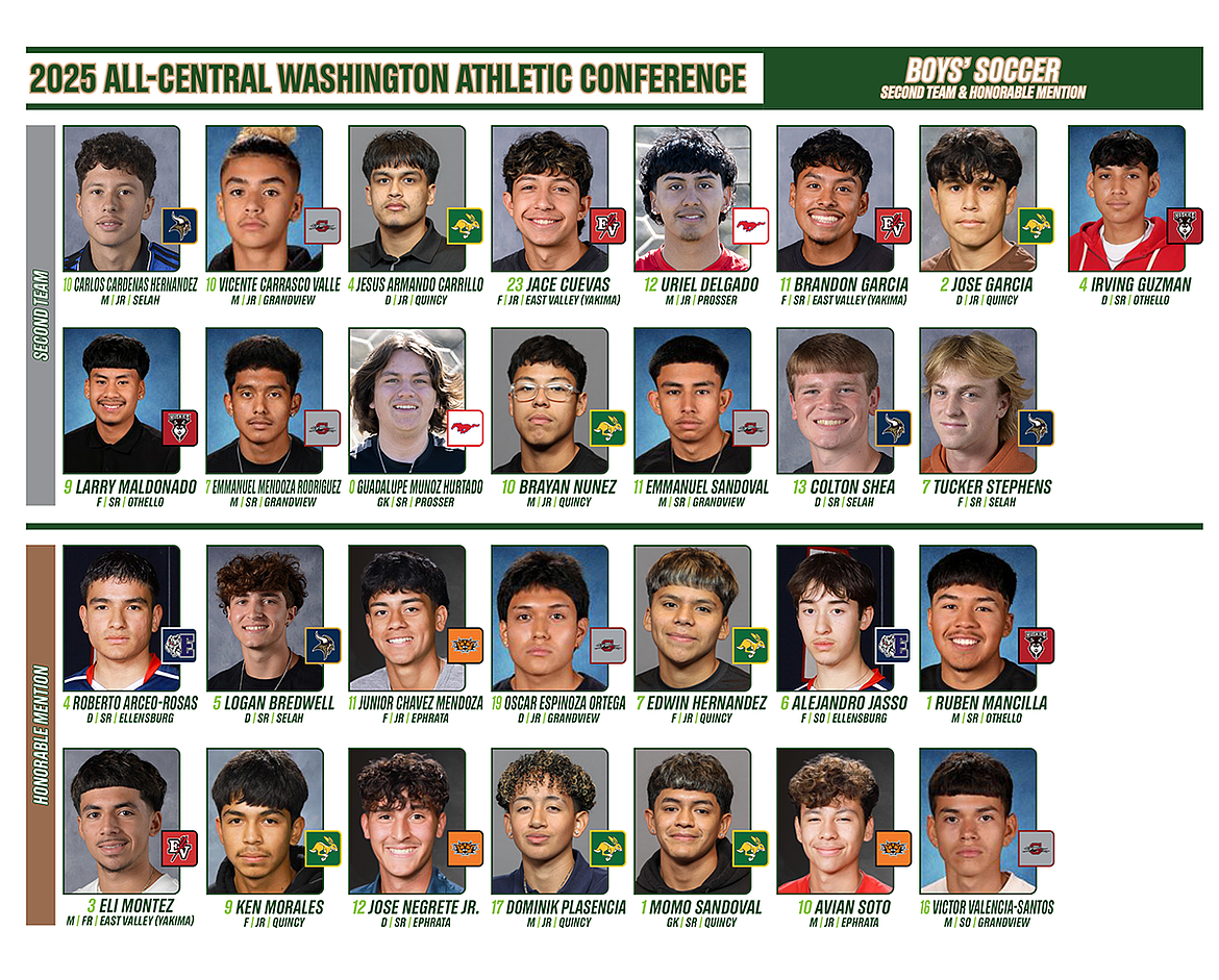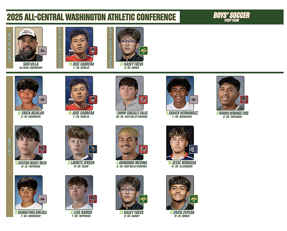 COLUMBIA BASIN — The Central Washington Athletic Conference has announced its All-Conference teams for boys soccer. The first, second, and honorable mention teams were announced, including offensive and defensive players of the year, officials announced Tuesday.