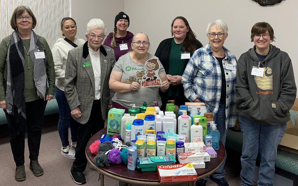 Members of the Moses Lake Woman’s Club and Elsa Borrego of New Hope stand behind the club’s April donation of hygiene products to the shelter. Also pictured is the club’s mascot Flat Mabel, who travels in her two-dimensional form from club to club. From left: Jackie Theis-Chmela, Borrego holding Flat Mabel, Margaret Schiffner, Jessica Myrick, Beth Lee, Nichol Davis, Kaye Ward and Mary Steele.