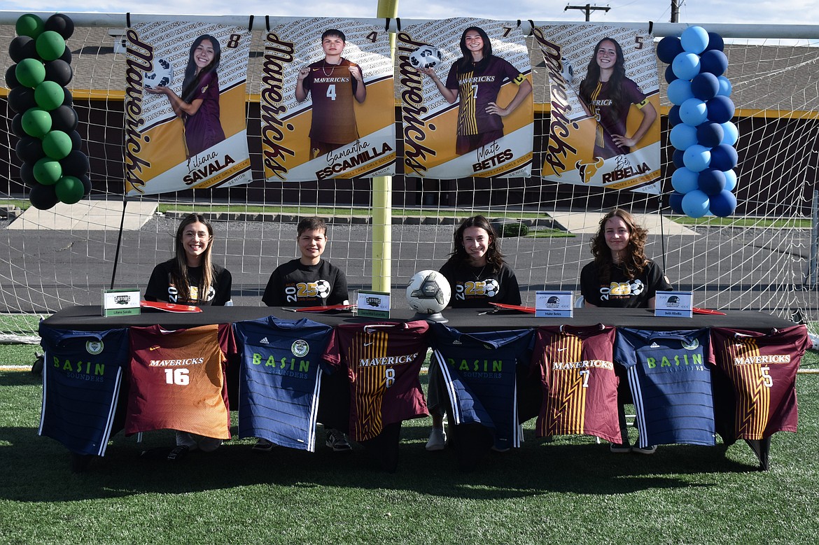 MOSES LAKE – Moses Lake Mavericks Liliana Savala, Samantha Escamilla, Maite Betes and Beth Ribellia signed their letters of intent to play college soccer Tuesday evening on Lions Field. Liliana and Samantha Escamilla will be signing with Green River Community College, while Maite and Beth will sign with Columbia Basin College.