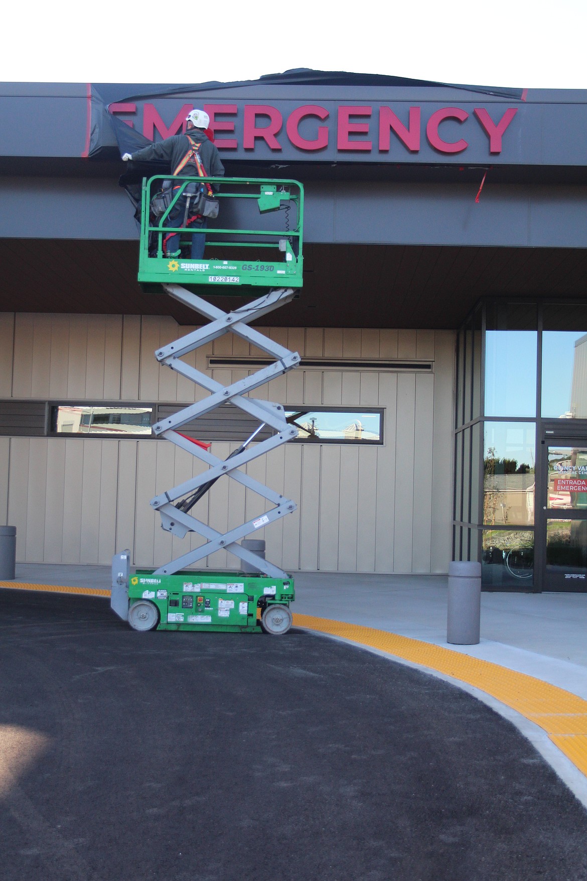 The new hospital officially opened when the covers that had been placed over the signs were removed. But the signs had been up a while and over time, the tarps got a little weather-beaten. Communications Director Shannon Durfee studied them and was concerned that one of them looked a little dirty. Bishop studied it too.