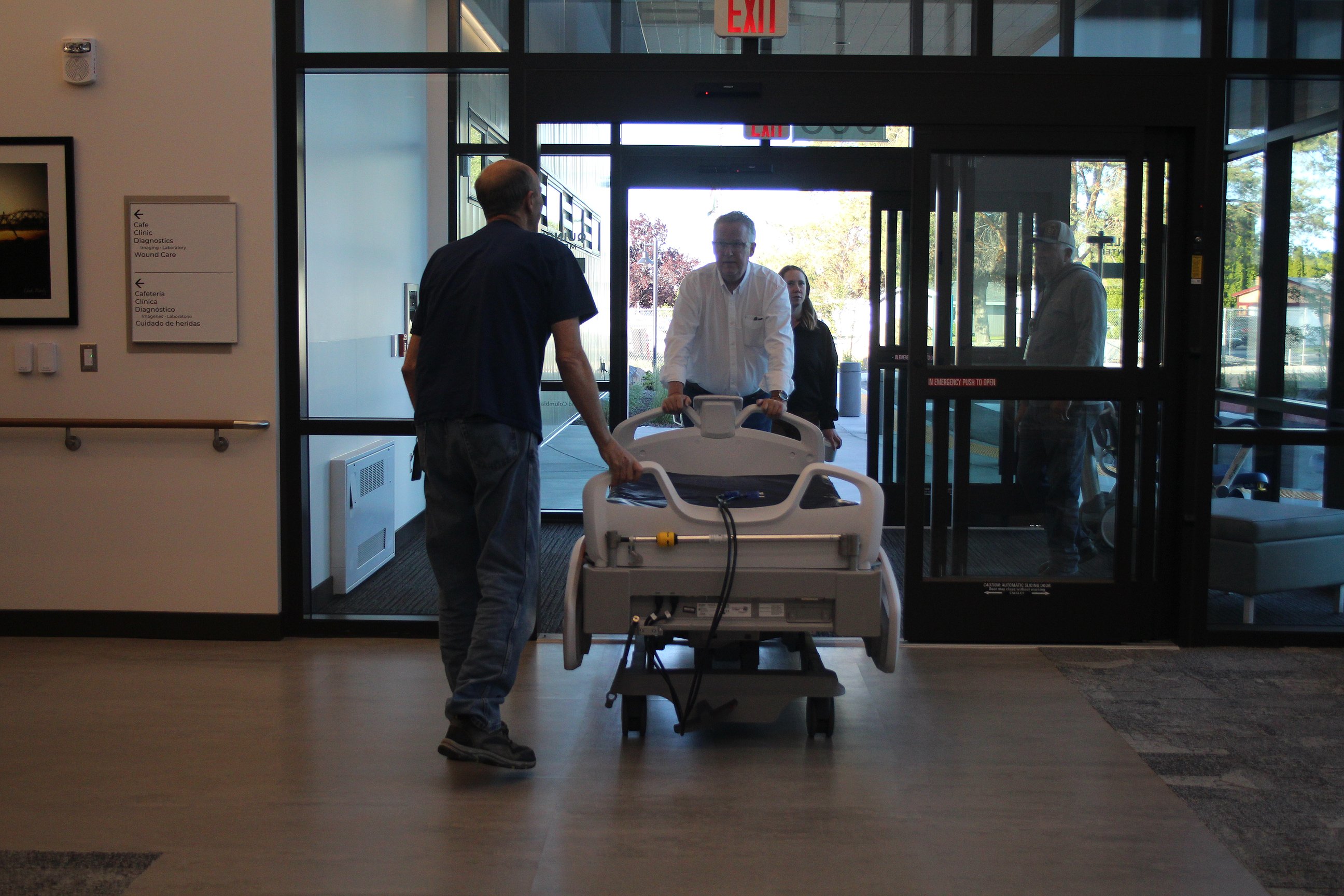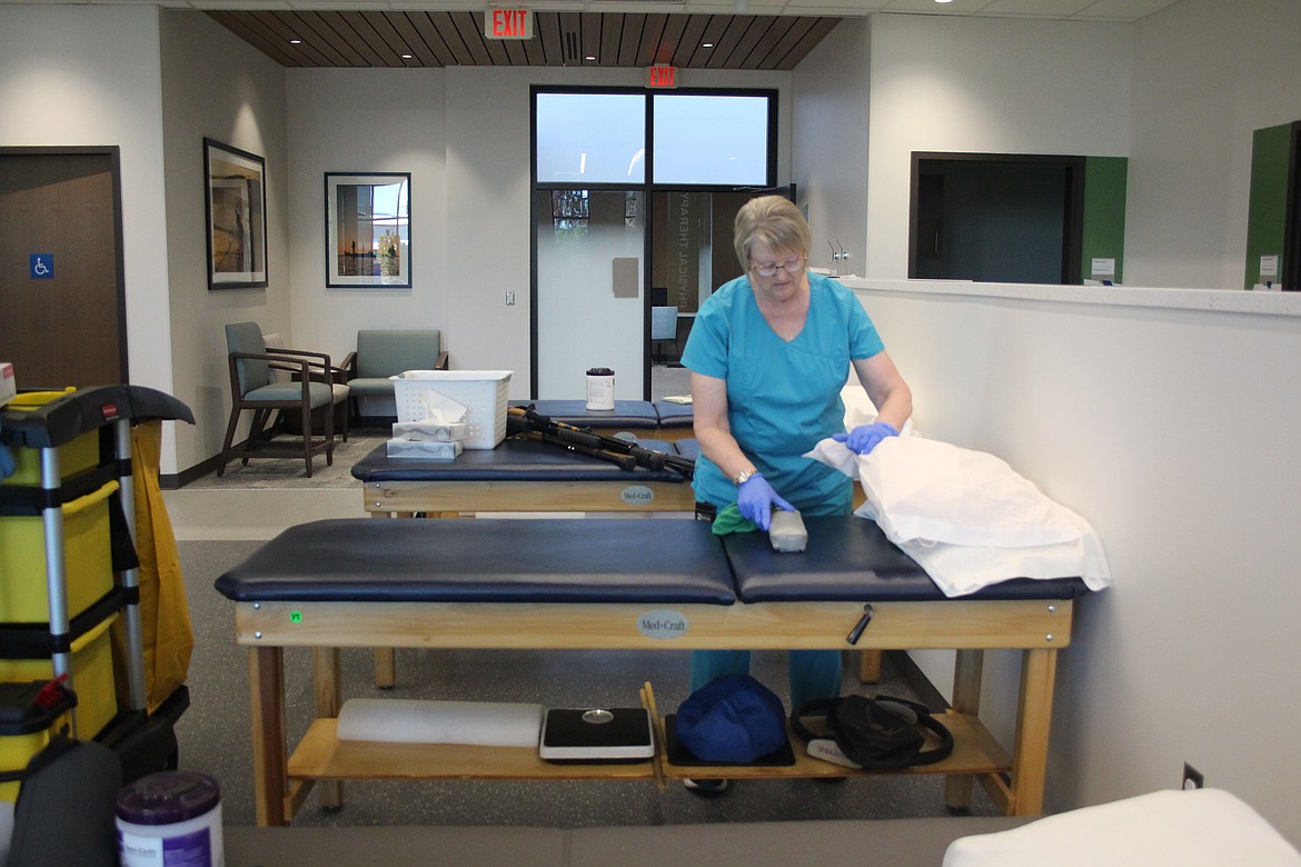 Chief Executive Officer Glenda Bishop and Kayla Van Lieshout of the Klosh Group were pulling up the last pieces of cardboard protecting the floors in the new hospital’s entryway, Sageview Clinic and the wound care department. Not all hospital departments were open to patients at 7 a.m.; some started treating patients later on Wednesday, while others will open later in the week.